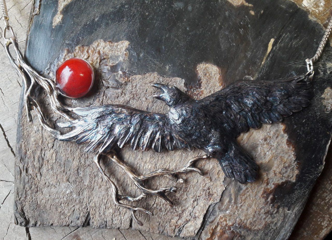 Grand collier de style naturaliste représentant un corbeau à l'envol,sur fond de branchage et soleil couchant,