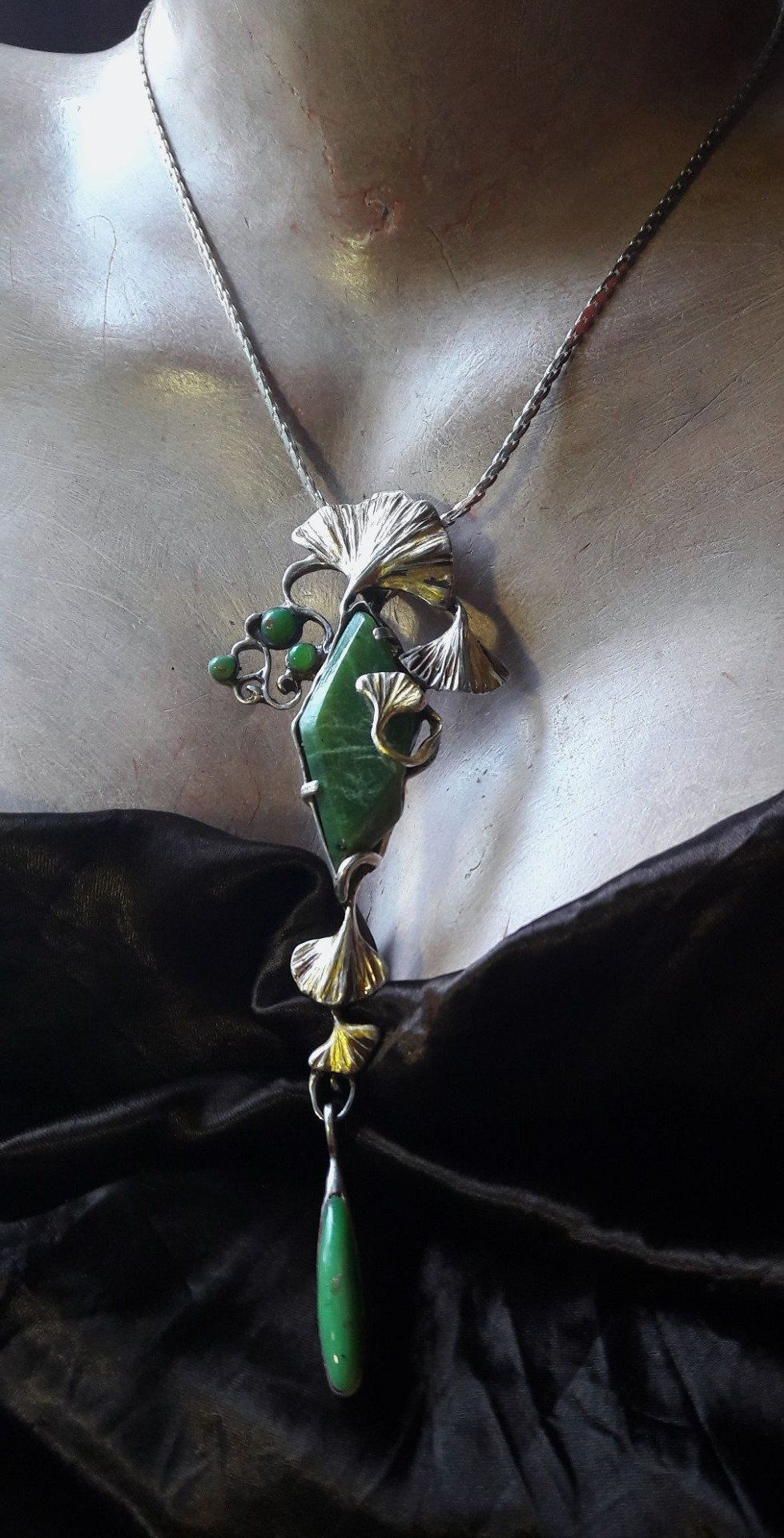 Pendentif Art Nouveau ginkgo et jade