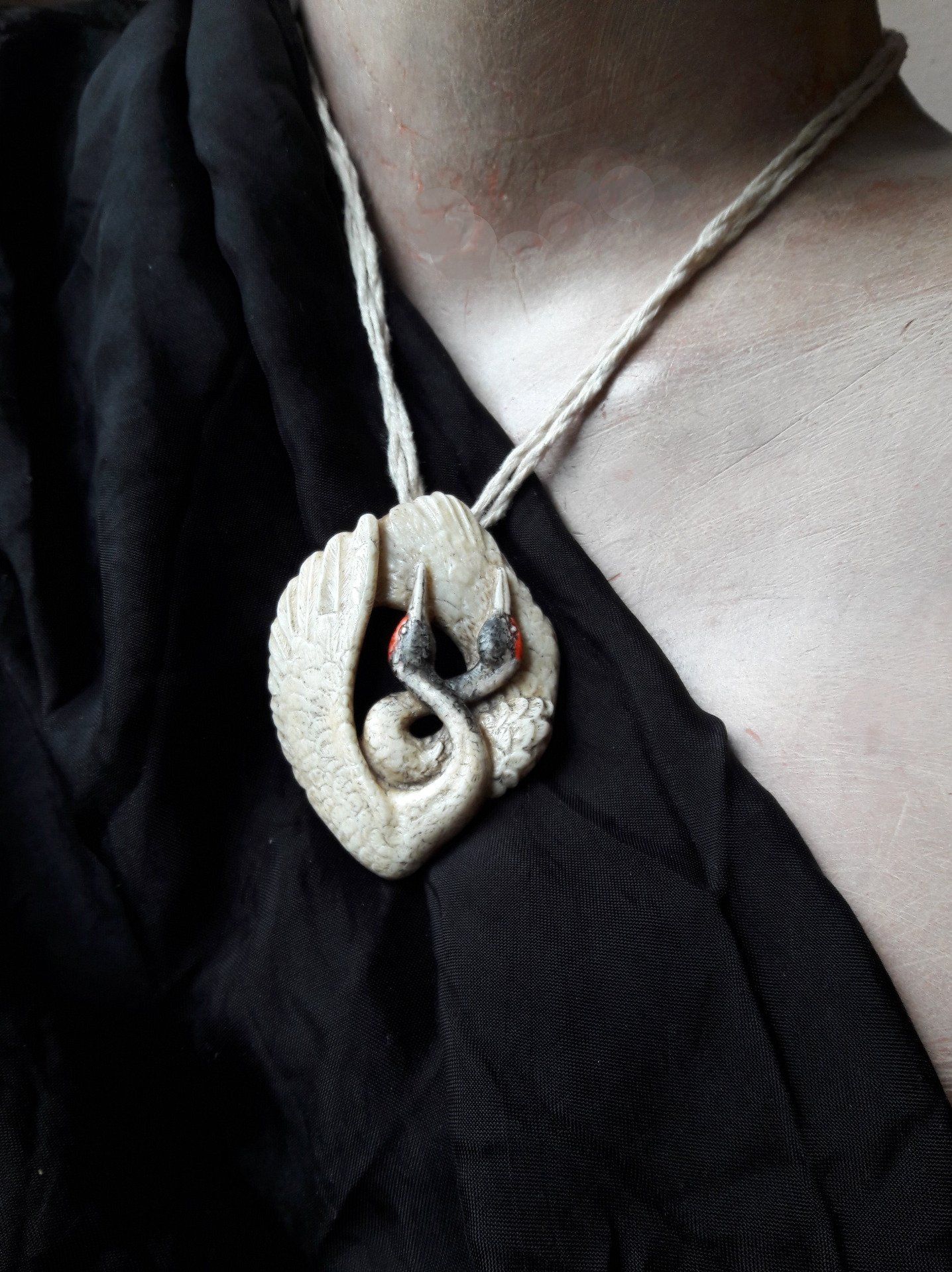 Pendentif de style naturaliste en os sculpté, évoquant la parade nuptiale des grues